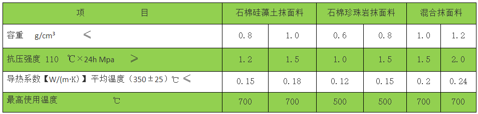 我公司生产的抹面料,是以多种轻体无机矿物质为填料,适量化学添加剂和复合高温粘合剂,经特殊工艺复合而成。具有轻质,阻燃,美观,导热系数小,隔热性能好,粘接强度大,干燥时间短,便于施工等特点。 抹面料理化指标