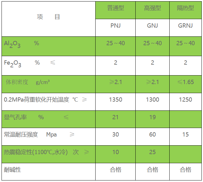 高强耐碱砖是由低铝叶腊石或低铝耐火粘土为主要原料,先经过制粒、制粉工序后,按一定比例混合后,添加几种添加剂,经压制成型,高温烧成的制品。该产品在水泥窑系统中具有耐碱侵蚀特性,在高温下会与碱金属氧化物反应生成高粘度的液相,形成一层釉化状保护层,覆盖在砖的表面堵塞表面气孔,以阻止碱金属熔融物的渗透和侵蚀,起到耐碱抗侵蚀的目的。按理化指标分为普通型、高强型和隔热型三个牌号。主要用于水泥窑预热器、分解炉、三次风管、回转窑、水泥窑用耐火砖等部位。