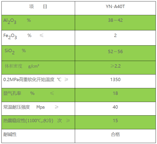 高强耐碱砖YN-A40T是由低铝耐火粘土或低铝焦宝石熟料为主要原料,先经过制粒、制粉工序后,按一定比例混合后,经压制成型,高温烧制而成的制品。该产品在水泥窑系统中具有抗碱侵蚀特性,在高温下会与碱金属氧化物反应生成高粘度的液相,形成一层釉化状保护层,覆盖在砖的表面堵塞表面气孔,以阻止K+、Na+碱金属熔融物的渗透和侵蚀,起到耐碱抗侵蚀的目的。它比高强耐碱耐火砖RK-H的荷重软化温度高、耐气体冲刷、耐磨损。主要用于水泥窑预热器、分解炉、三次风管、回转窑等部位。