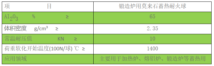 锻造炉用莫来石蓄热球和莫来石蓄热耐火球是以优质莫来石、刚玉、氧化铝微粉和结合剂经混合、成型、烧成的实心球体。按直径大小分为φ60mm、φ50mm、φ40mm、φ35mm、φ30mm、φ25mm、φ20mm、φ18mm、φ15mm九种规格。主要用于加热炉、熔铝炉、锻造炉等窑炉。